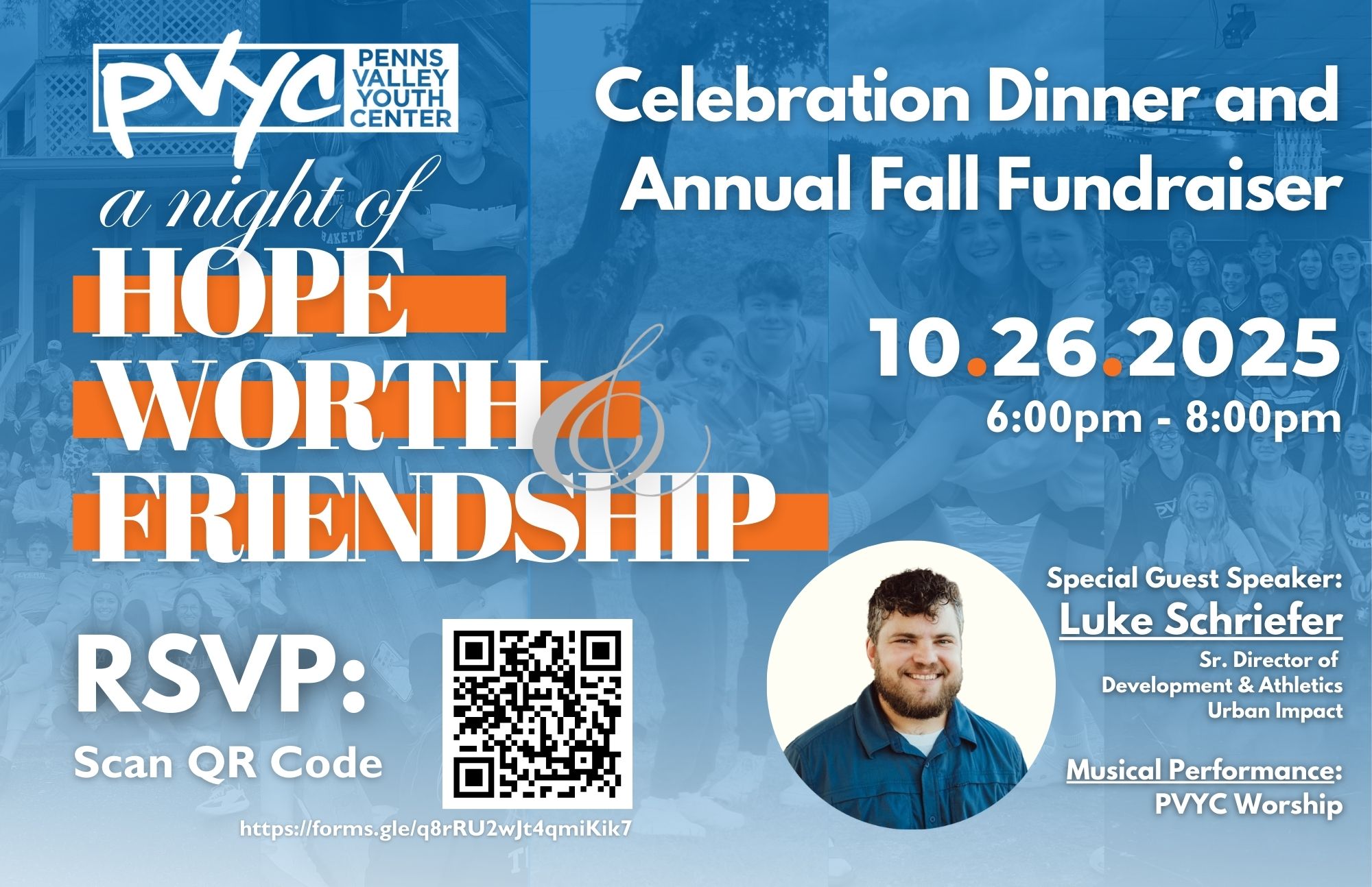 I personally invite you to join us on Sunday, October 26th from 6 – 8pm at the Old Gregg School Community Center for our Celebration Dinner and Annual Fall Fundraiser, a night full of vision and inspirational stories of hope, worth, and friendship. Come and see all that has and will be happening through PVYC, and how you can be a partner in the mission and vision that is making a difference in the lives of students and families in the Penns Valley community.
